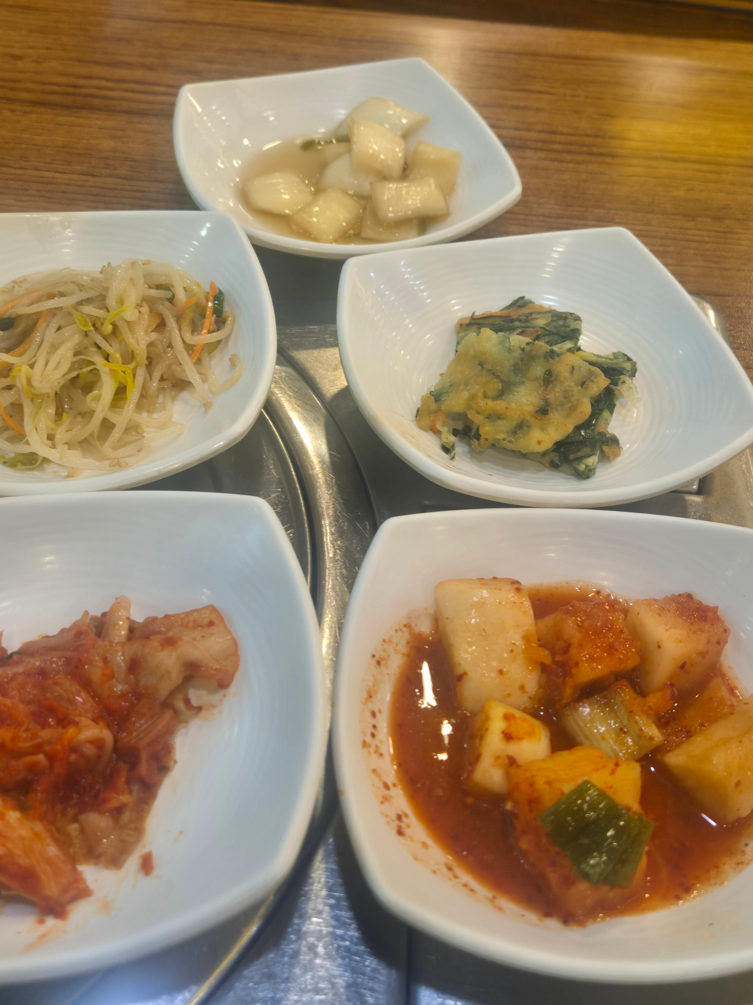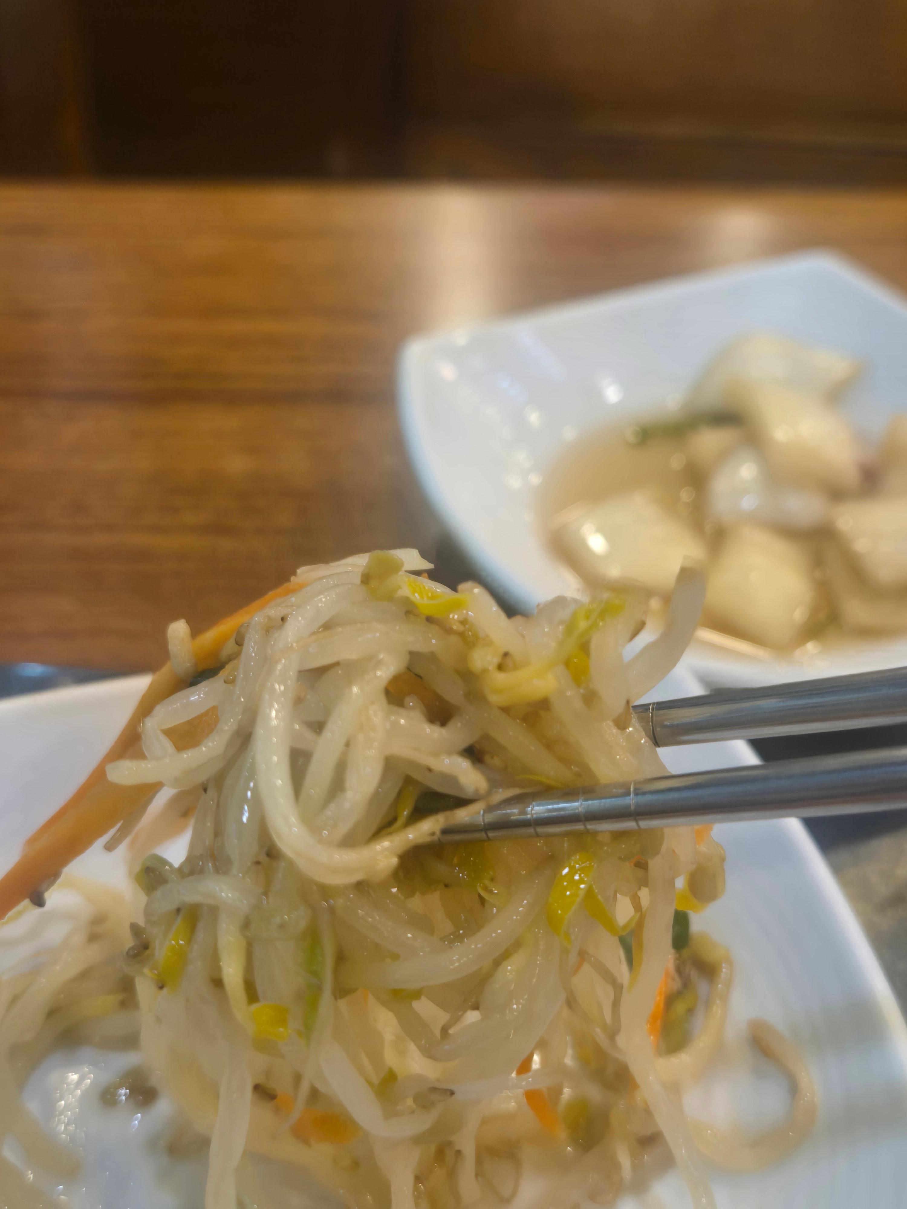 김치, 숙주나물, 전 등이 나왔고 추가 반찬은 리필할 수 있습니다.