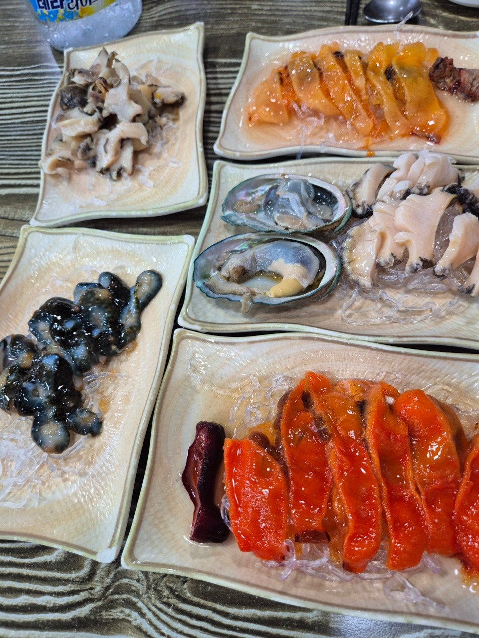 싱싱한 멍게, 다른 횟집에서는 잘 안 나오는 해삼, 향이 진하고 색이 예쁜 꽃멍게, 전복, 쫄깃한 소라 먹다 보면 이미 소주 한 병입니다.