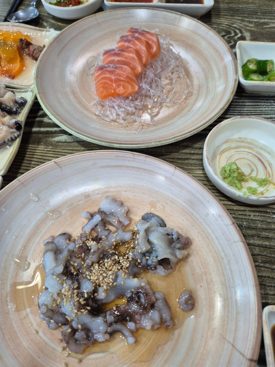 이곳 횟집의 가장 좋은 점은 쓸데없는 곁들이찬은 전혀 없고 정말 신선한 해산물 위주로 나온다는 거예요.