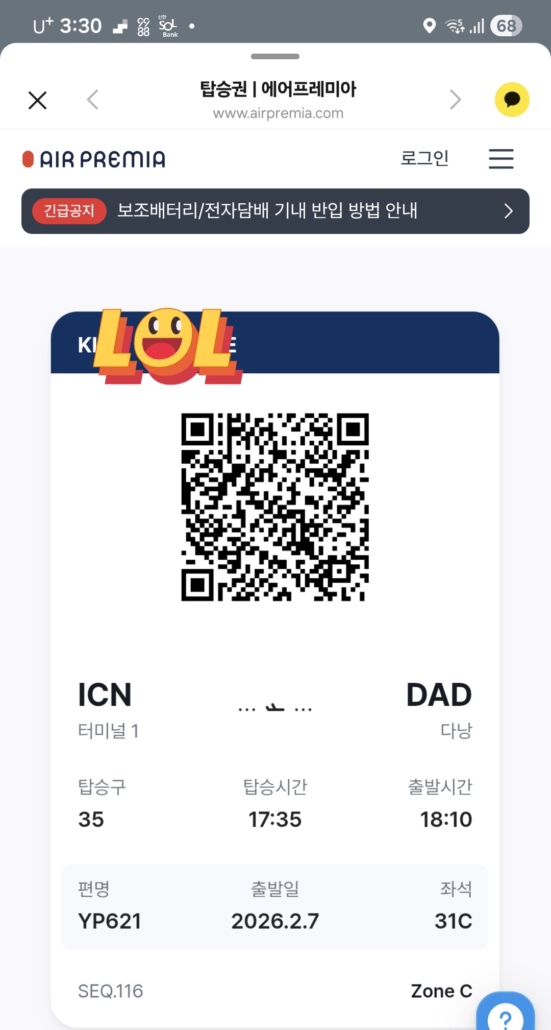 이번 다낭여행에서 제가 탑승한 항공편은