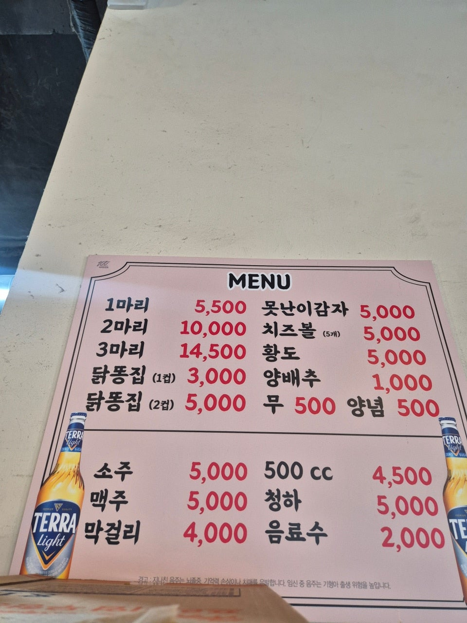 | 소주/맥주/청하 | 각 5,000원 |