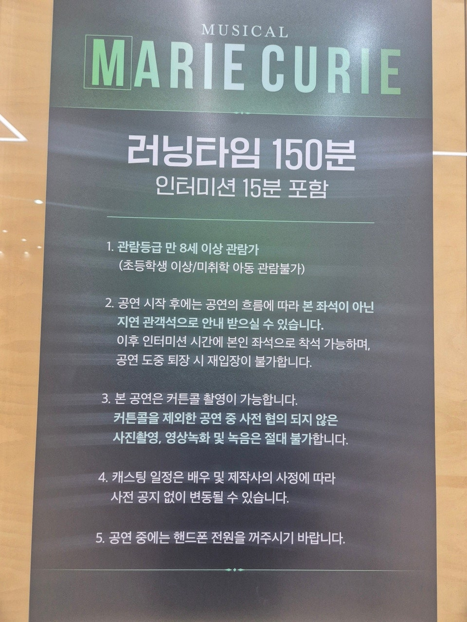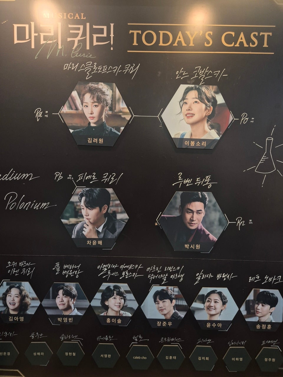 폭발적인 성량이 없으면 절대 할 수 없는 배역 마리 스클로도프스카 퀴리 역에는 이번 시즌에는 김소향, 박혜나, 옥주현 그리고 오늘의 배우 김려원입니다. 다른 배우님은 워낙 많은 작품으로 봤지만 김려원 배우님은 스윙데이즈 이후로 처음 보네요.