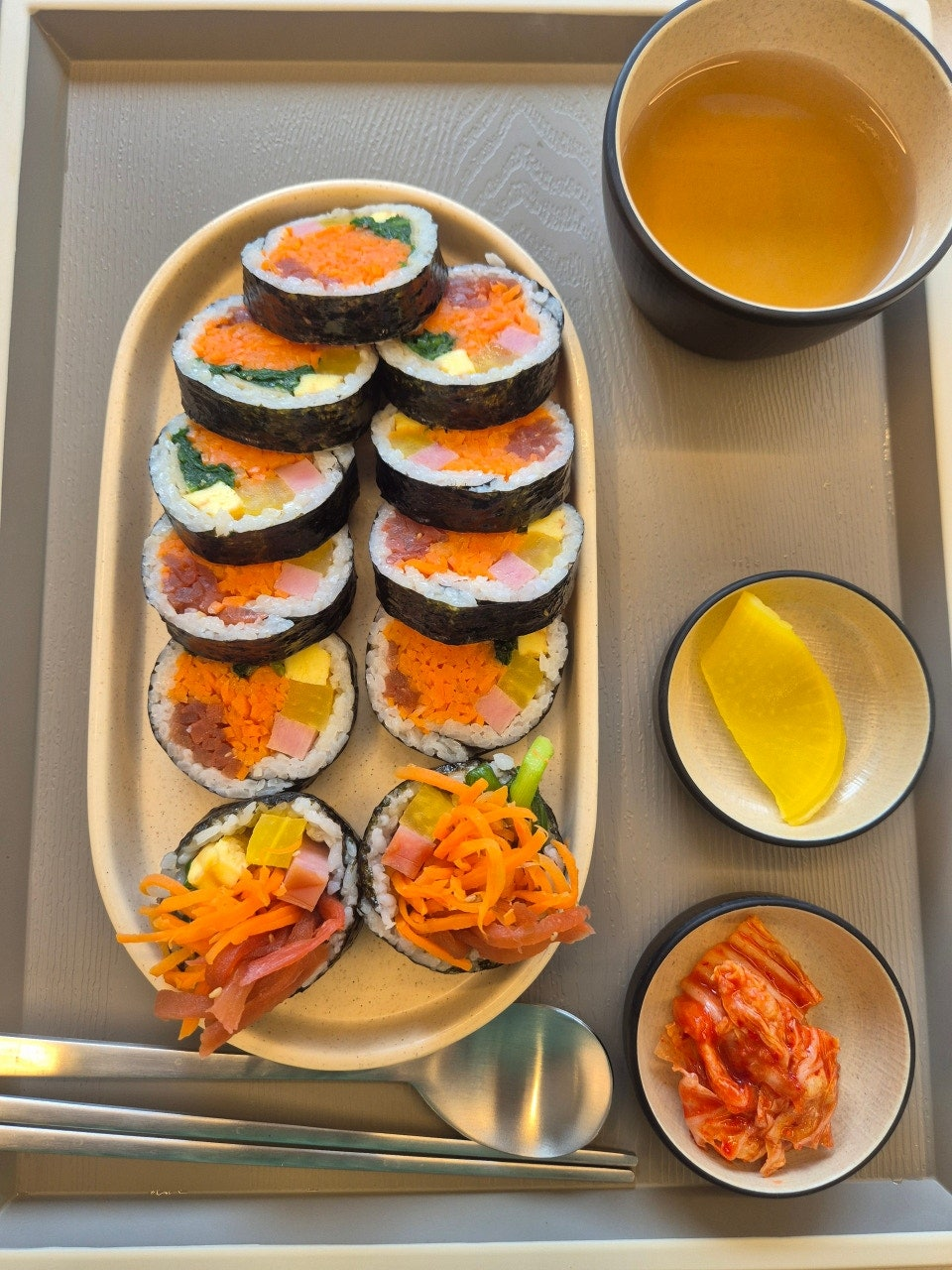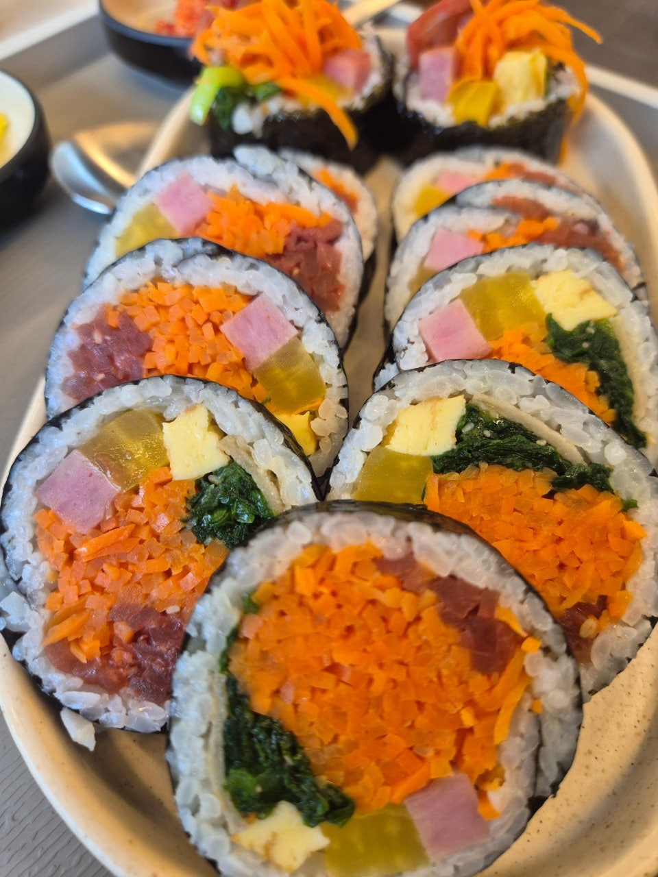 일단 비주얼은 완전 합격입니다. 너무 예쁘게 잘 싸셨네요. 김밥맛은 제가 좋아하는 맛입니다.