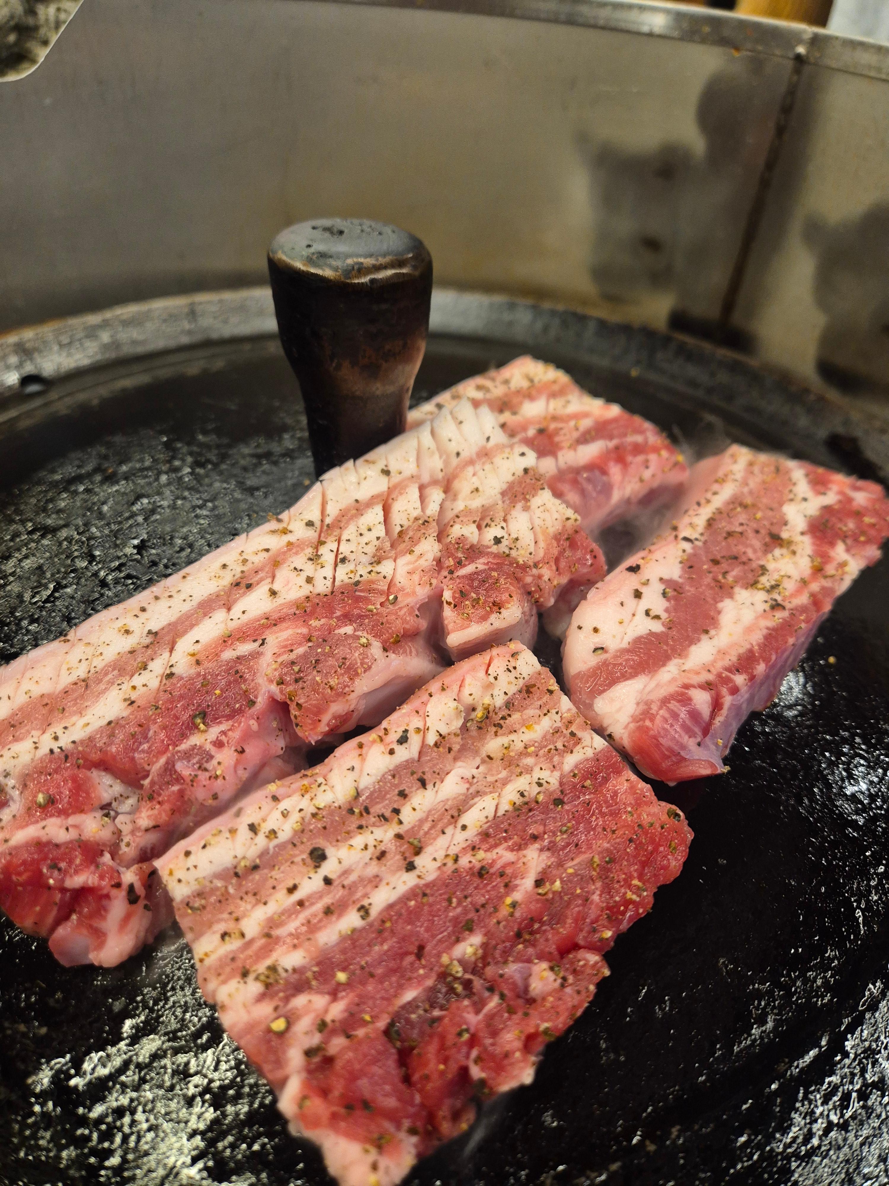 이 집의 대표 메뉴는 단연 미박삼겹살입니다. 껍질이 살짝 붙어 있는 삼겹살이라 식감이 쫀득하고 고소함이 살아 있어요.