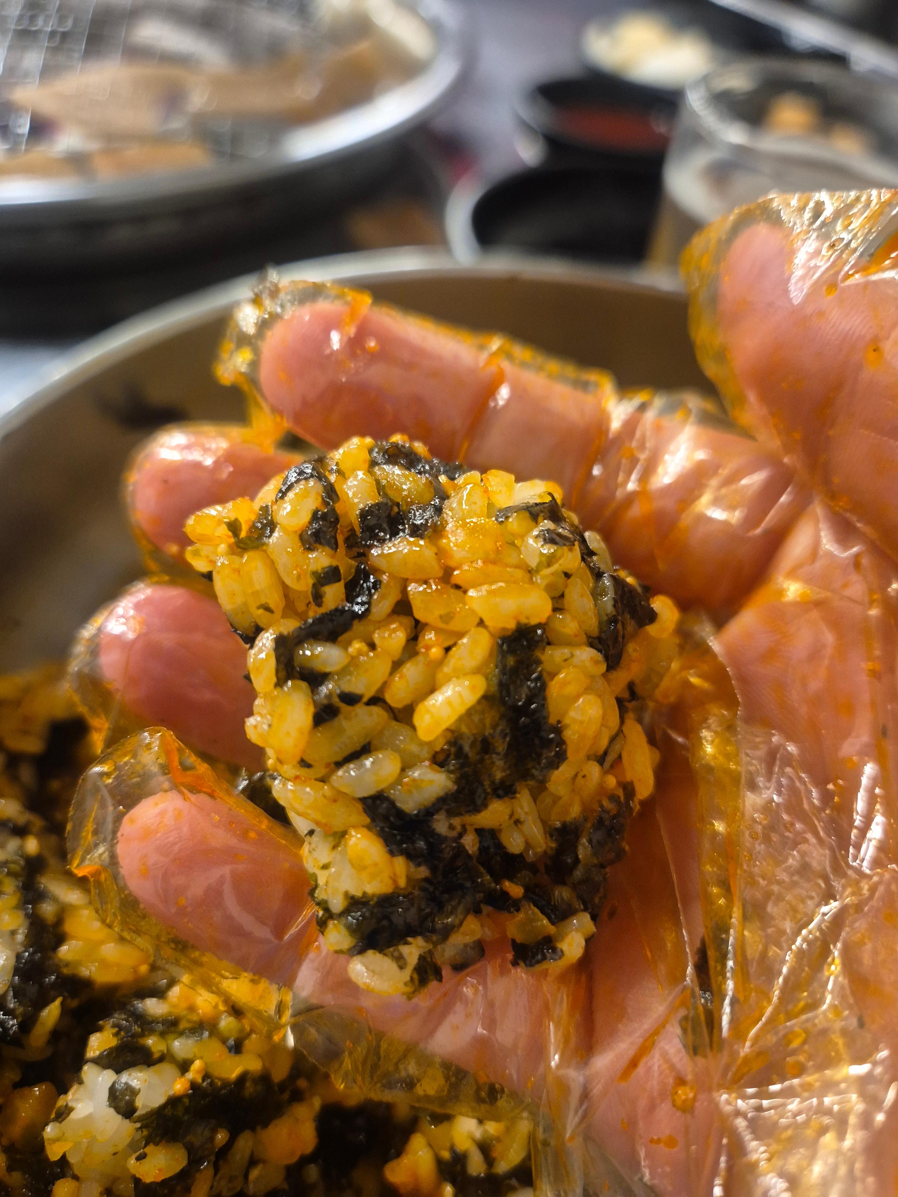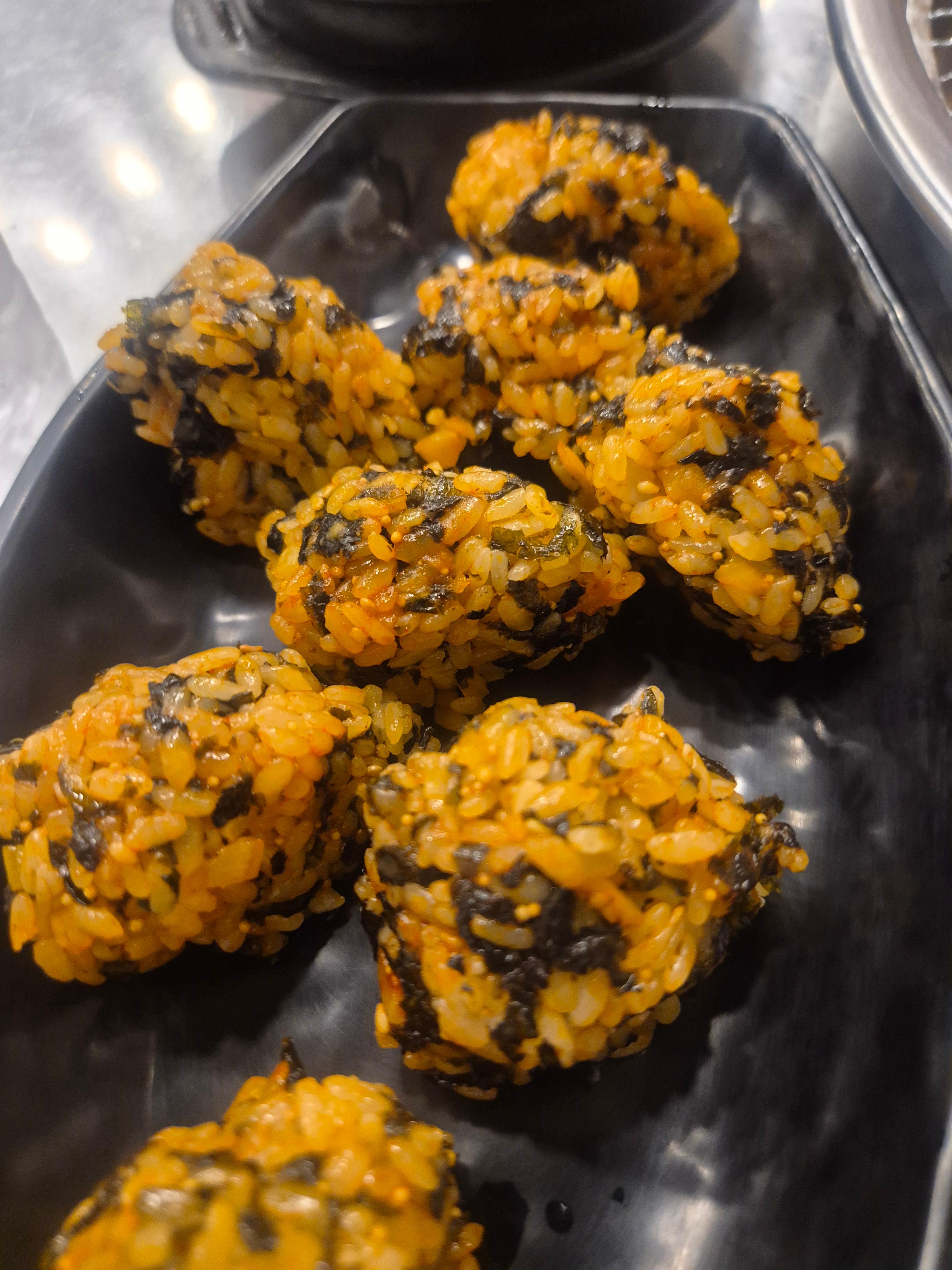 쪽갈비와 함께 주문한 메뉴는 매운 주먹밥입니다.