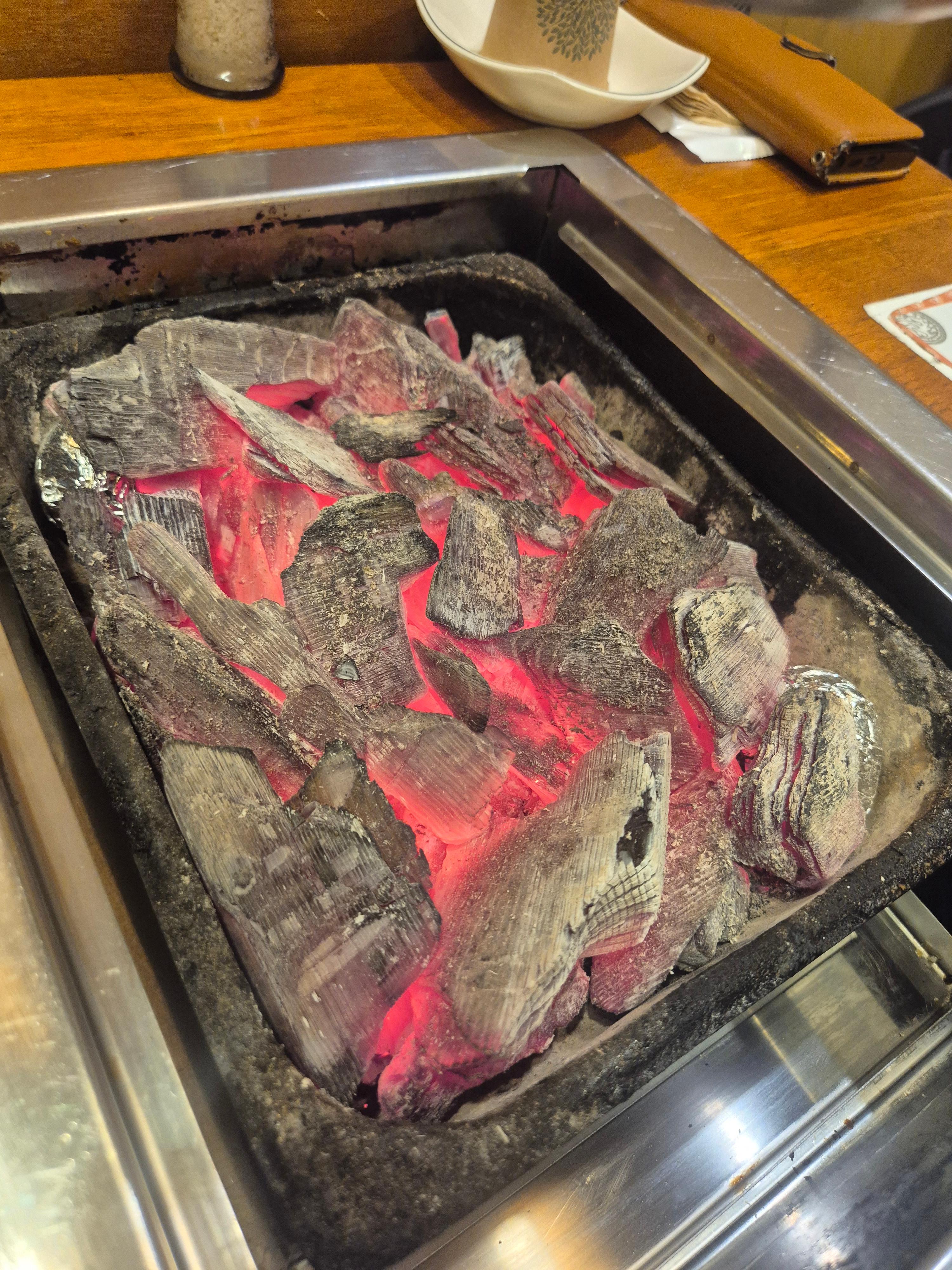 국내산 참숯 백탄이 들어옵니다. 순식간에 앞자리가 따뜻해졌어요.