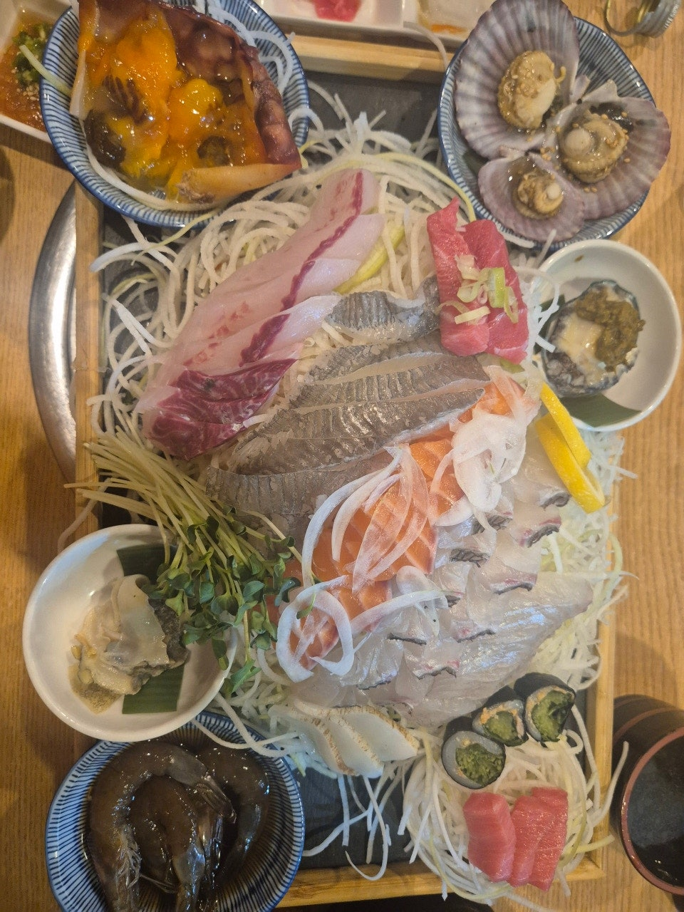 드디어 대망의 모듬회가 나옵니다. 짜잔~~~ 이게 5만2천원(2025년 4월 기준) 이라니 너무나도 다양한 회가 펼쳐져 있습니다. 맛있는 것은 딱 세점씩 그리고 제철 생선들이 매인으로 나온네요.