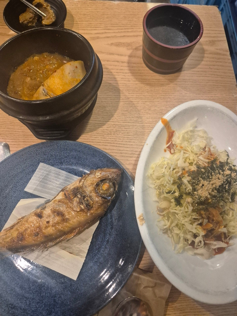 주문하자마자 음식들이 정말 신속하게 나옵니다. 참치머리조림은 약간 비리고 저 생선은 맛있어 보이지만 뭔 맛인지 모르는 심심한 맛 나머지는 그저 구색 맞추기 식입니다. 그래도 인심이 너무 좋아서 패스~~