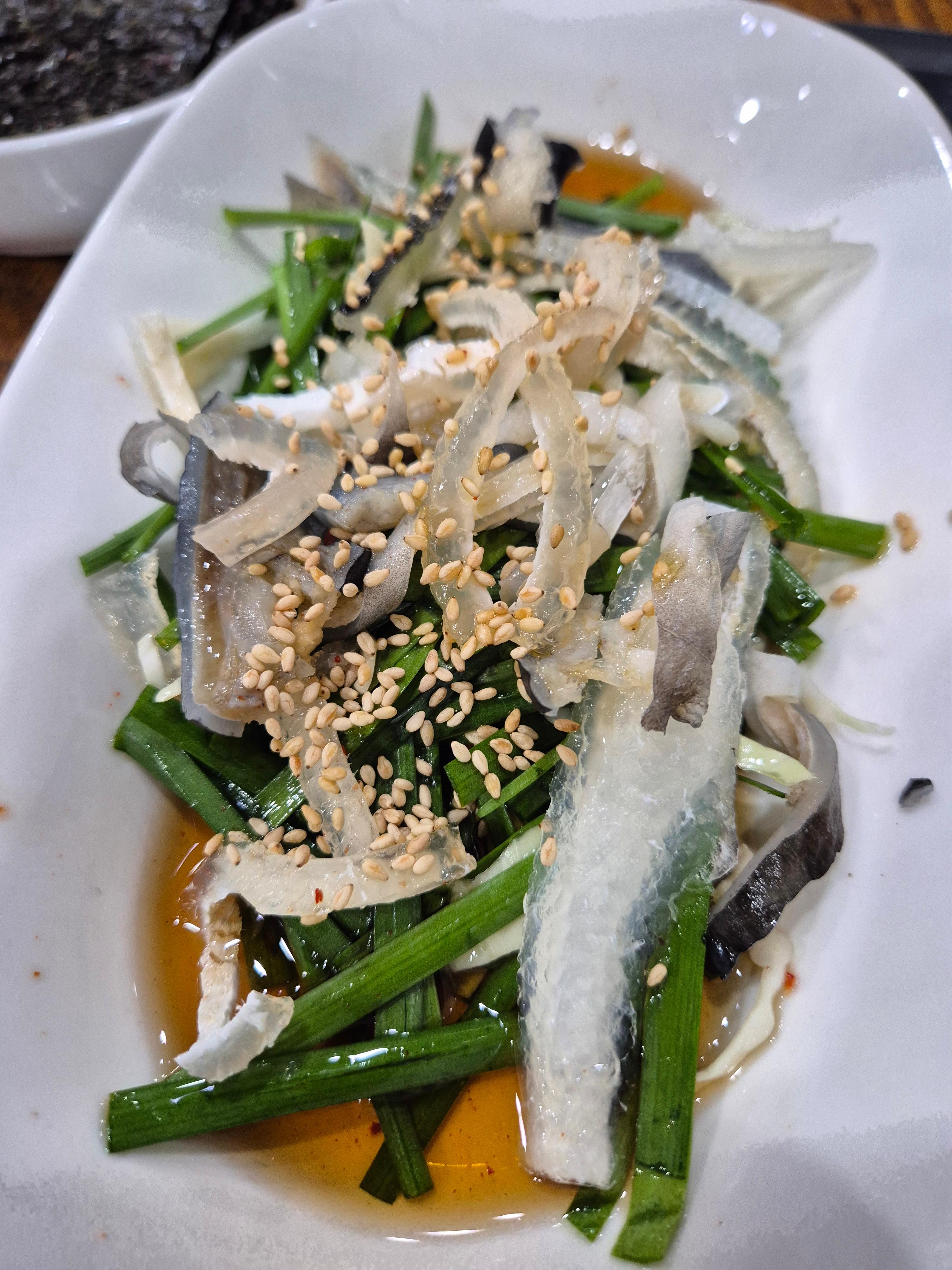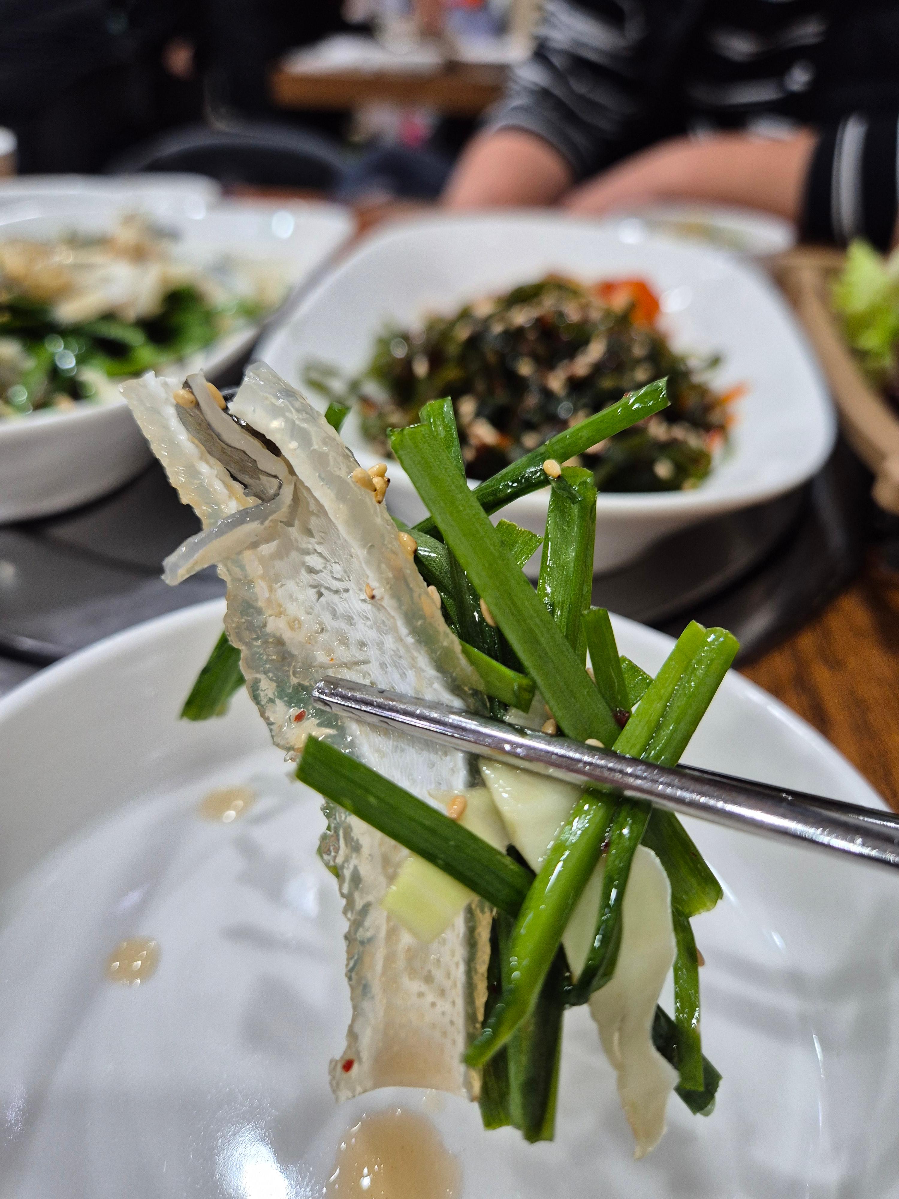 초장에 살짝 찍어 먹어도 맛있고, 새싹과 무채를 곁들여 먹으니 입안이 깔끔하게 정리되는 느낌이었죠.