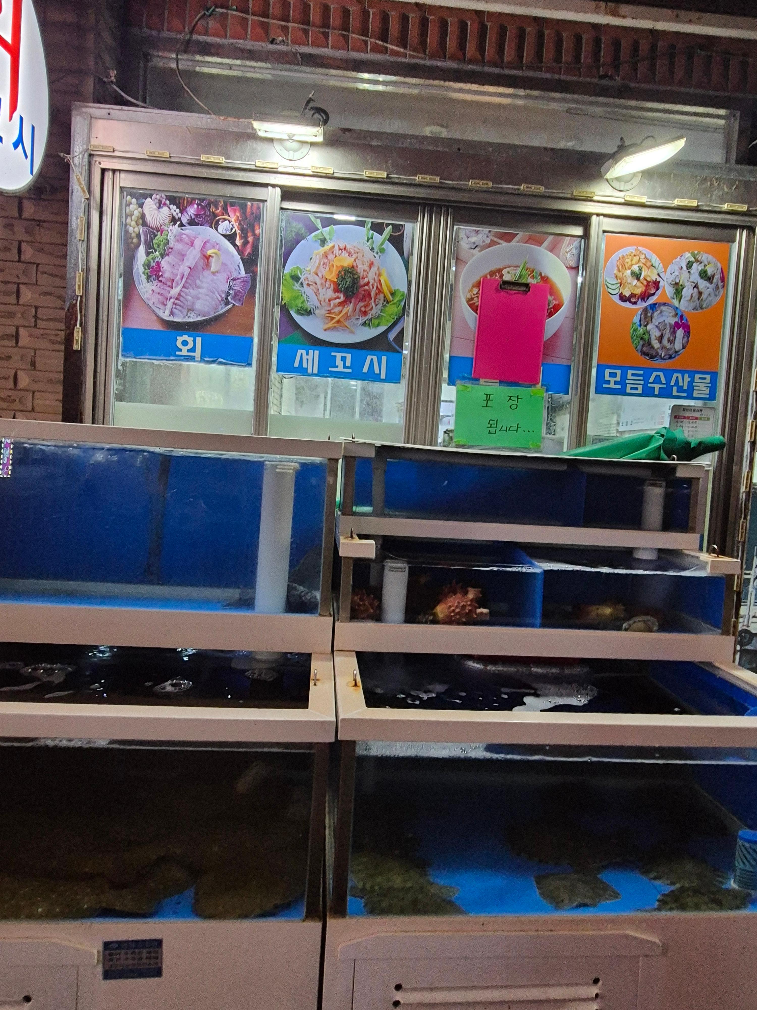 간판은 크지 않지만, 밖에서 보이는 커다란 수조와 싱싱한 활어들이 눈에 띕니다.