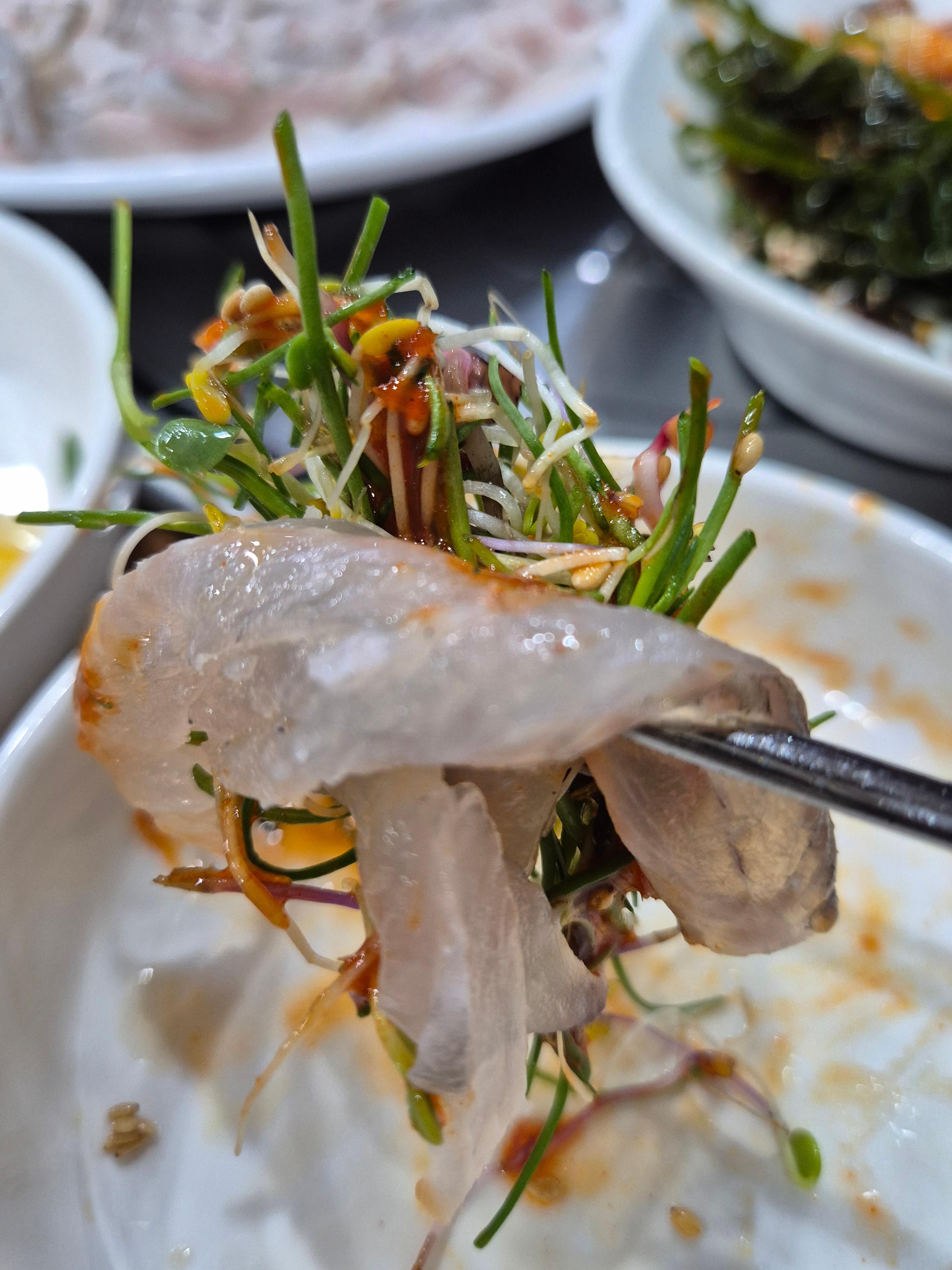 신선한 회는 그 자체로도 훌륭했지만, 김이나 상추에 싸서 먹으니 풍미가 더 좋았어요.