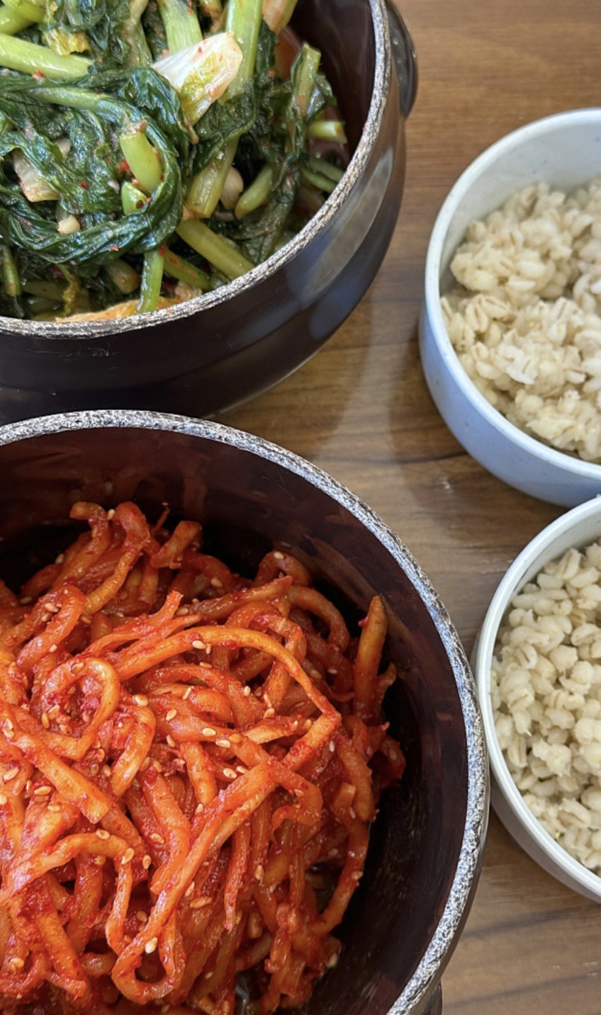 같이 나온 보리밥에 생채와 열무 그리고 테이블 위에 있는 고추장을 쓱쓱 비벼 먹으면 감자옹심이를 기다리는데 많은 도움이 된답니다.