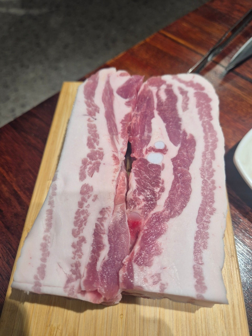 삼겹살 두께가 굉장히 만족스러웠고, 지방부위도 적절하게 잘 퍼져 있어요.