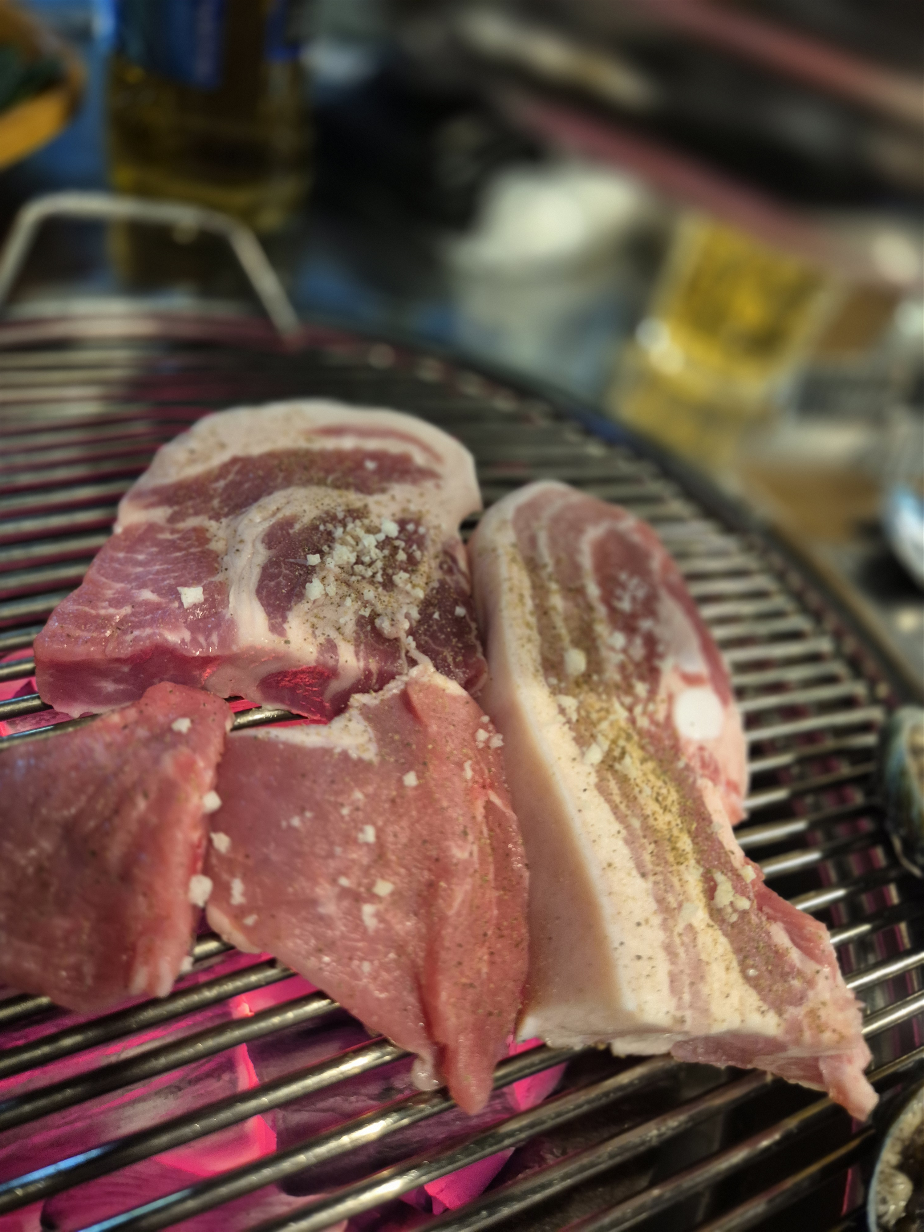 제가 주문한 건 대표 메뉴인 소금구이와 삼겹살 각 일 인분 주문했어요. 저희가 굽다가도 직원이 중간중간 와서 고기를 뒤집어주며 잘 익혀지는지 신경 써서 뒤집어주시고 친절하십니다. 덕분에 입만 넣으면 되더군요. 고소한 고기 한점이 오늘 하루의 피곤함과 스트레스를 확 날려주네요,