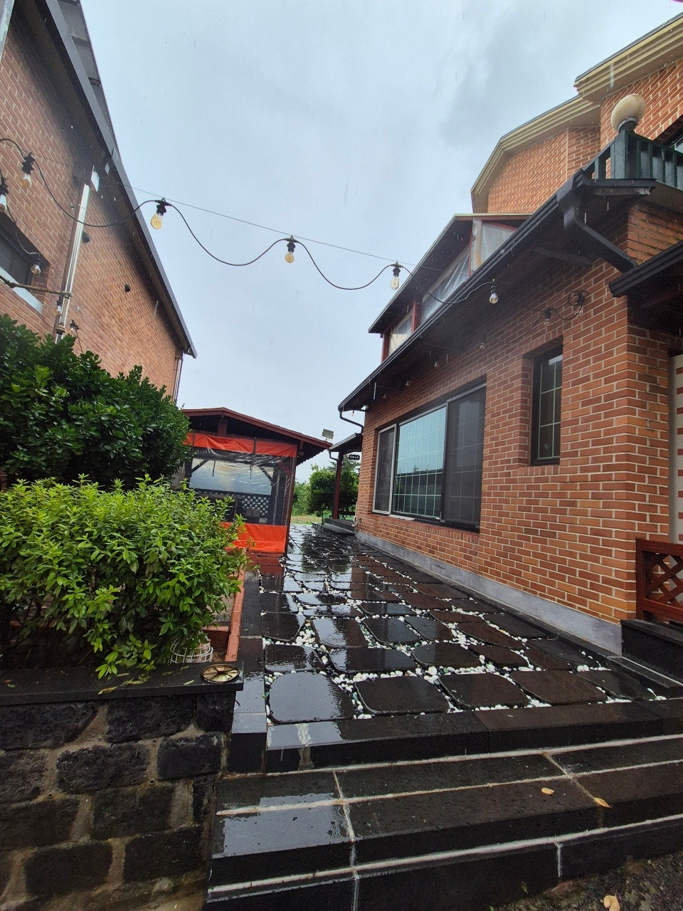 우리가 방문한 날 비바람이 몰아쳐서 바베큐장에 빗물이 들어오지 않게 세심하게 신경 써서 꼼꼼하게 막아주시느라 고생하셨습니다.