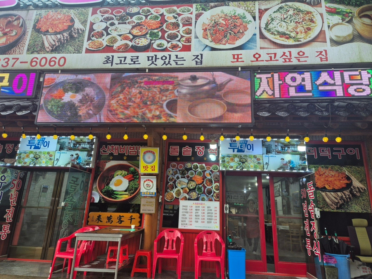 이곳은 산채정식이 유명한데요, 제철나물 위주의 반찬과 우렁된장찌개, 들기름으로 고소하게 양념된 도토리묵, 얇게 부쳐진 메밀 전을 시작으로 우렁초무침, 굴젓, 그리고 불고기와 일인 일 생선이 제공되고 있습니다.