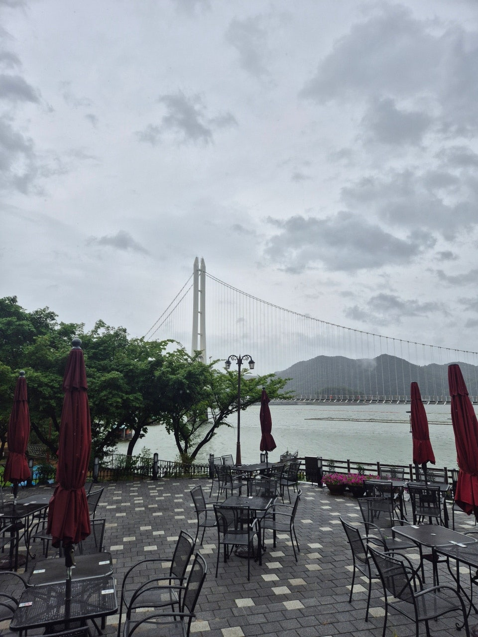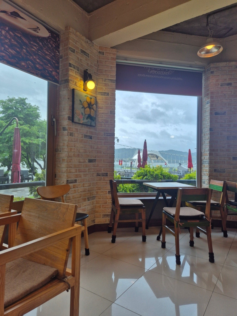 출렁다리와 호수를 바라보며 커피를 마실 수 있는 카페. 야외전경이 너무 멋져요. 비가 와서 실내로 들어왔지만 실내 인테리어도 아주 예쁘답니다
