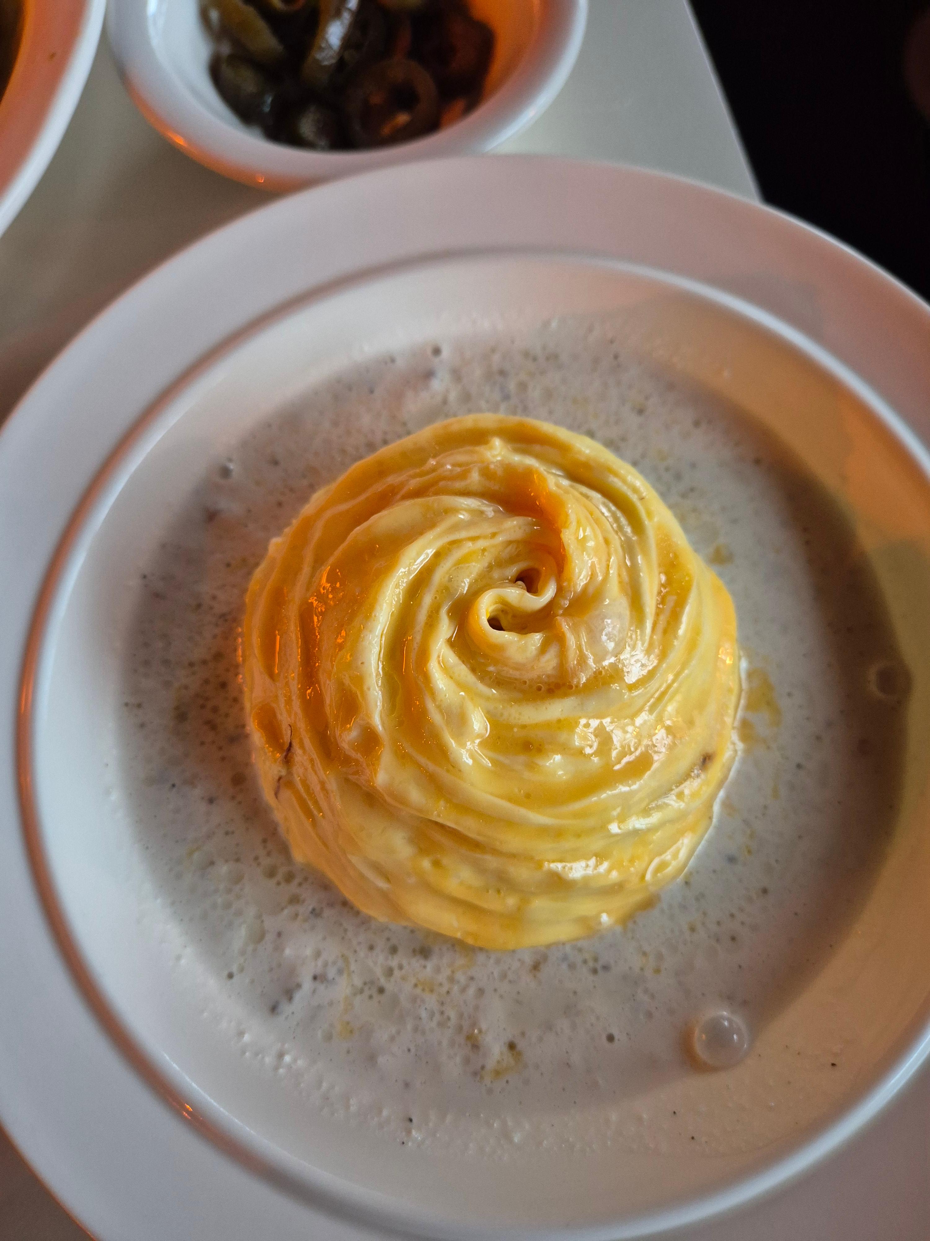 회오리처럼 멋지게 둘러진 계란은 예술입니다.