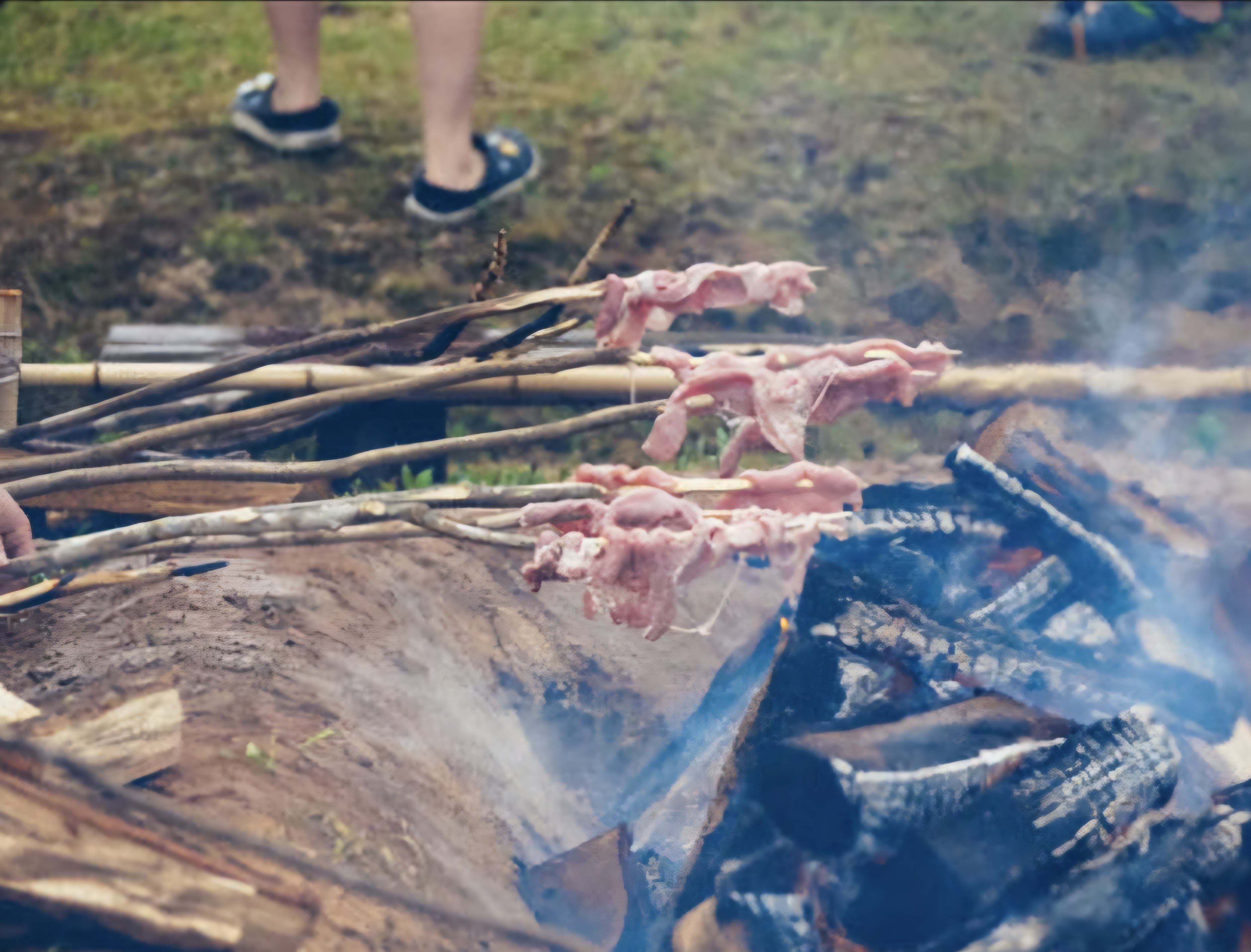 1m가 훌적 넘는 수제 나무꼬치에 꽂은 연천의 돼지고기를 참나무 숯불에 직업 구워먹는 대표 체험 프로그램이에요.
