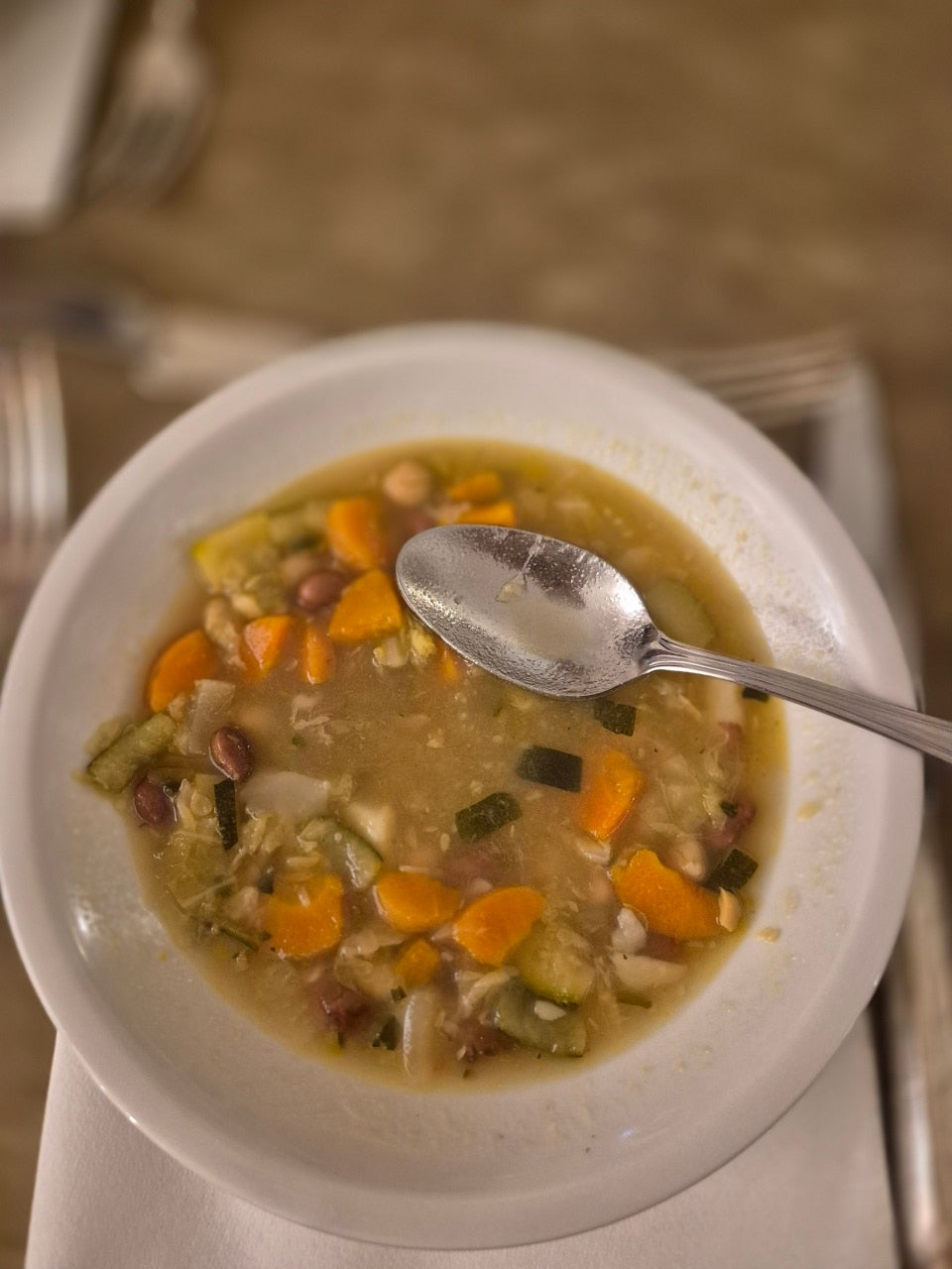 첫 번째로 베지타블 수프가 나옵니다. 야채가 섞인 콩수프인데 고소하고 맛있어요.